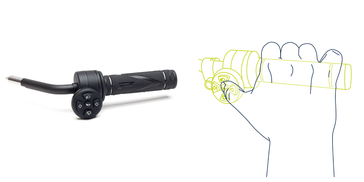 Обертанням ручки регулює прискорення, а горизонтальне натисканням виконує гальмування. За допомогою джойстика для великого пальця, можна керувати до семи функцій автомобіля, зокрема освітлення, покажчики повороту та склоочисники.