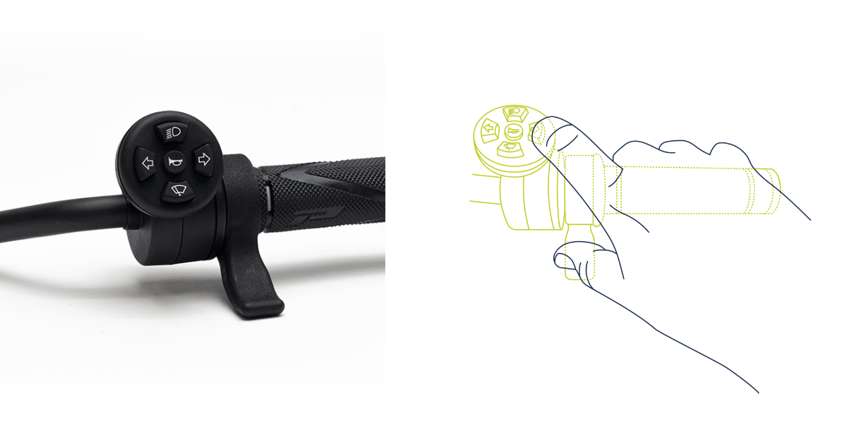 Сім центральних кнопок дозволяють одним дотиком керувати 12 основними функціями автомобіля, такими як освітлення, покажчики повороту, склоочисники та сигнал, не знижуючи маневреності та контроль над автомобілем.