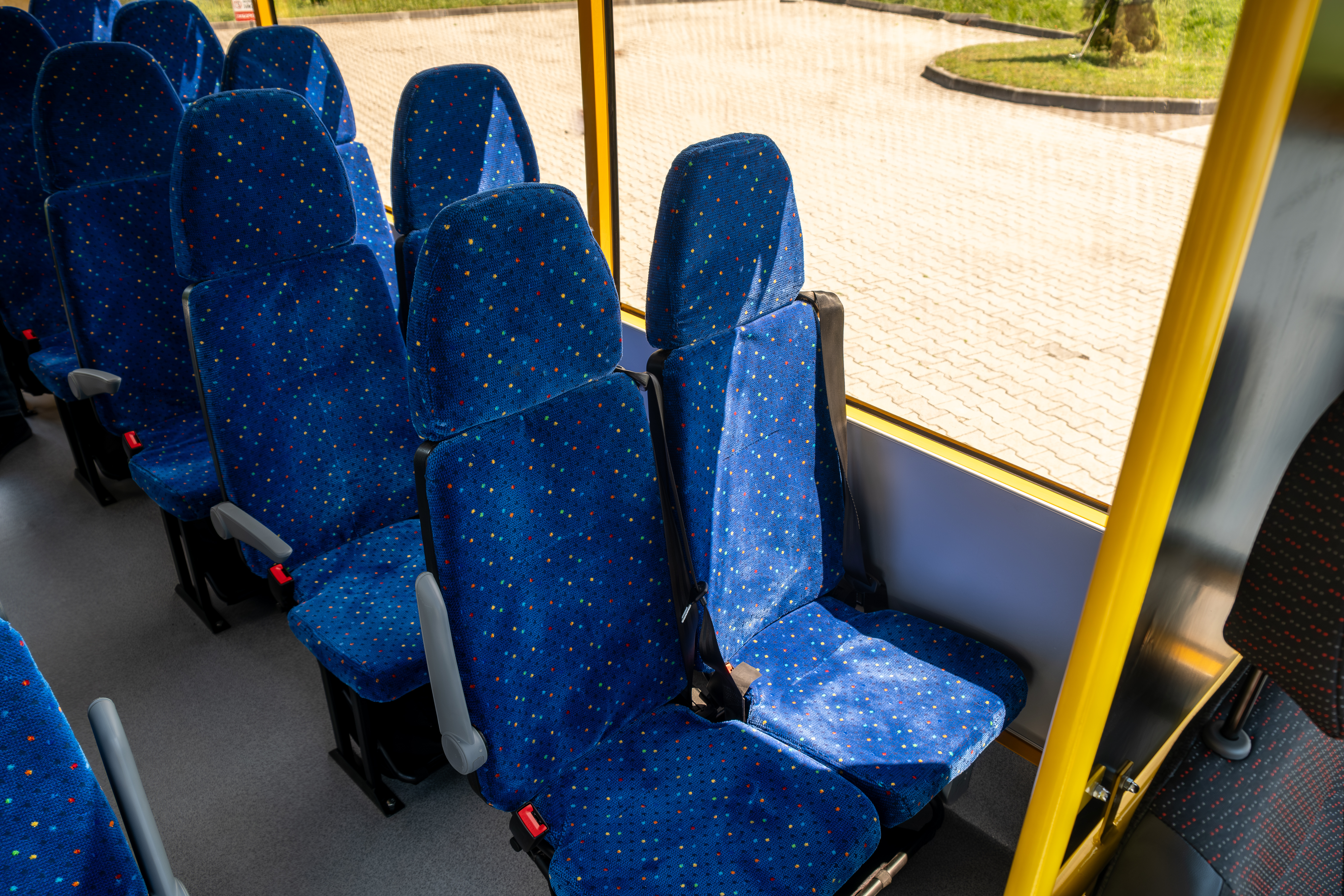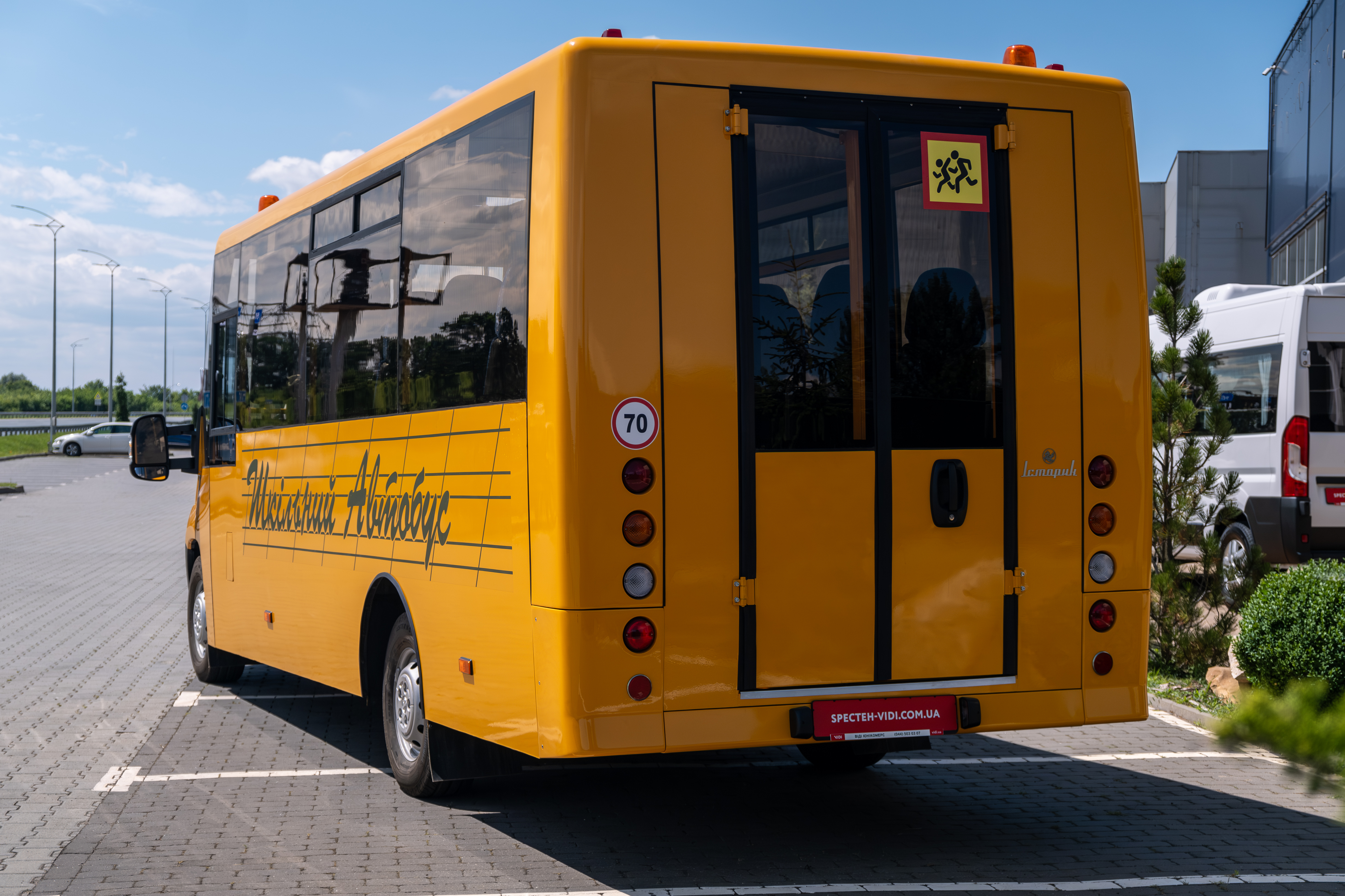 Жовтий кузов із розпізнавальними знаками «Діти» та проблискові маячки забезпечують впізнаваність і додаткову безпеку на дорозі. Автобус оснащений обмежувачем швидкості, тахографом та системою сигналізації для екстрених ситуацій.